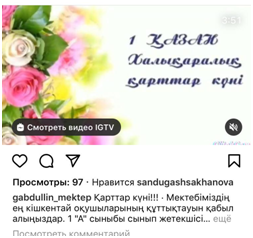 01 октябрь 2020 0 1 2 3 4 5 Қарттар мерекесі 1-қазан "Қарттар мерекесіне" орай қашықтықтан әр сынып бейнебаян жасап, қарттар мерекесімен құттықтады.